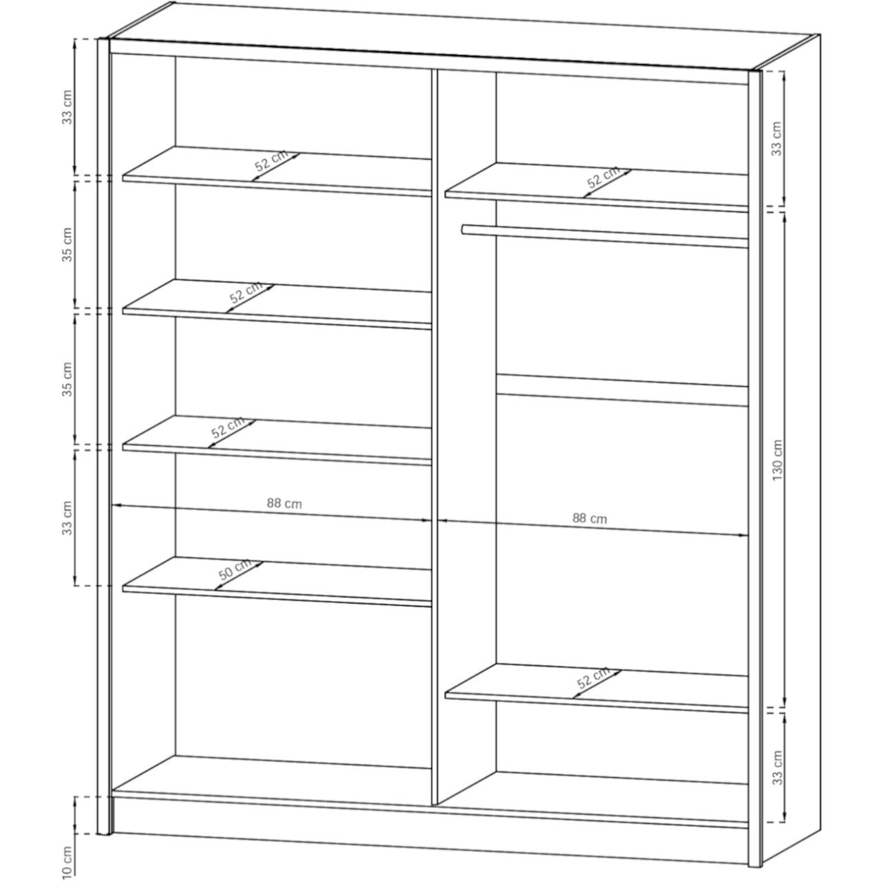 - Storage: Hanging rail, shelves, integrated drawers