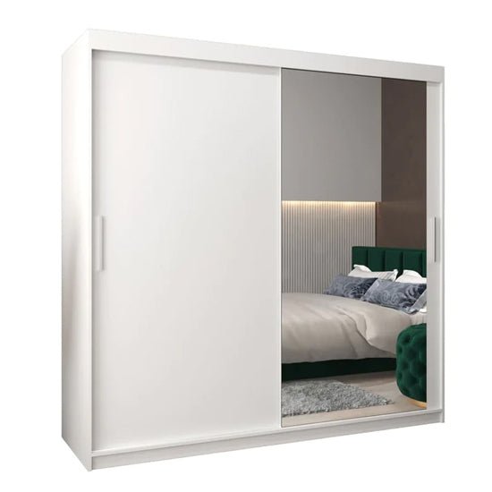 The CHOICEWARDROBE Tavira II 200cm Sliding Mirror Wardrobe in White is designed to deliver high-capacity storage with a clean, architectural presence. Its white finish brings clarity and balance to the bedroom, while the mirrored sliding panel enhances light flow and spatial depth.