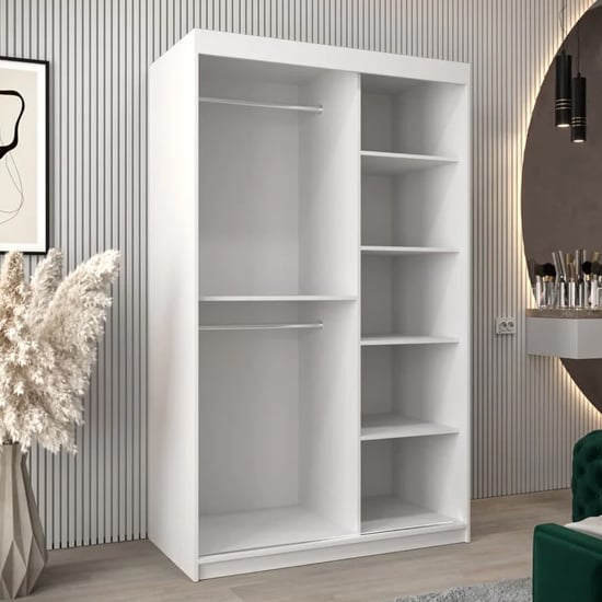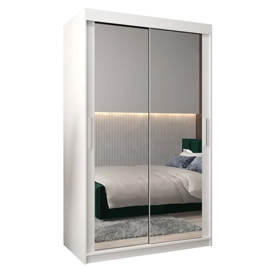 The Tavira III mirrored sliding wardrobe in a 120cm width is designed for compact bedrooms where space efficiency and visual clarity are essential. Finished in clean white with full mirrored doors, it enhances light flow while maintaining a calm, modern presence.