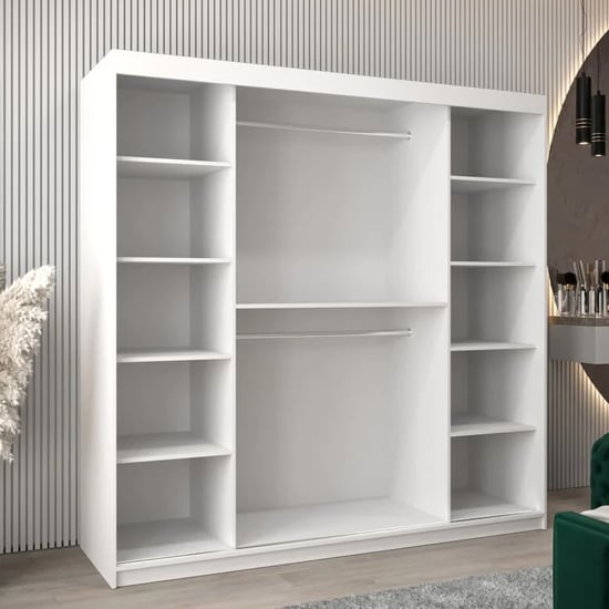 A refined storage solution designed for modern UK bedrooms, the Tavira III mirrored wardrobe delivers spatial efficiency, clean architectural lines, and long-term practicality. The white finish brings clarity and balance, while the mirrored sliding doors enhance light distribution and perceived room depth.