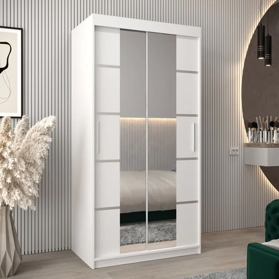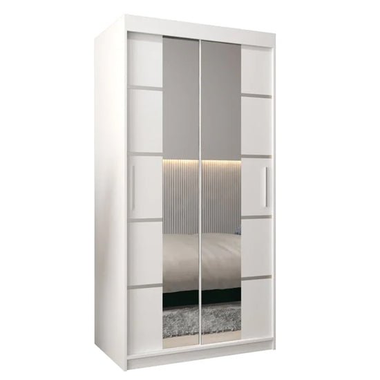 The CHOICEWARDROBE Vevey 100cm White Mirrored Sliding Door Wardrobe is a refined storage solution designed for modern bedrooms where space efficiency and visual clarity matter. Finished in a crisp white panelled design with full-length mirrored doors, this wardrobe enhances light, depth, and order within compact interiors.