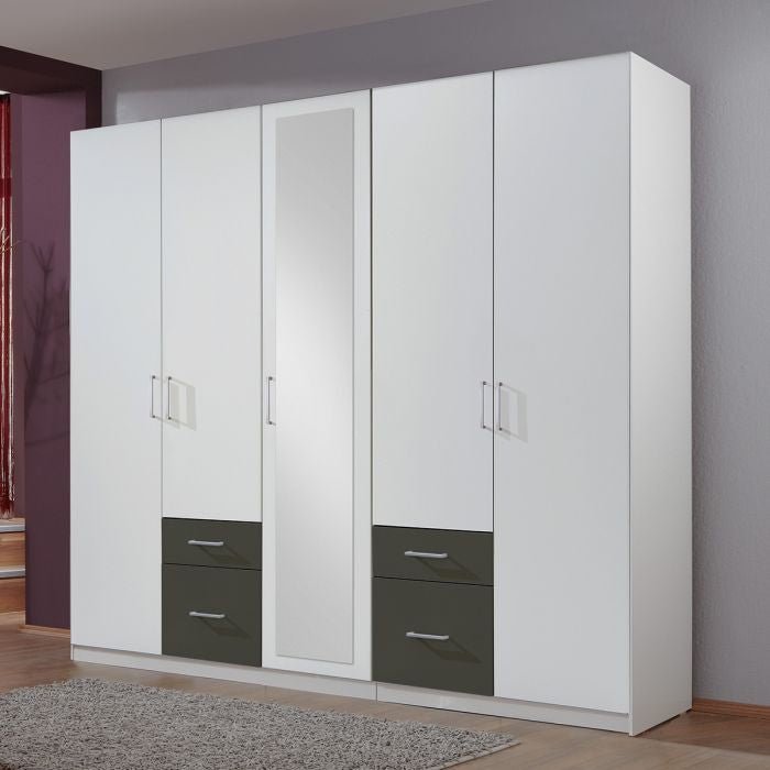 CHOICEWARDROBE Fresco 5 Door Wardrobe – White & Graphite Two Tone Finish | 225 cm Modern Design with Mirror, Drawers & Hanging Rails
