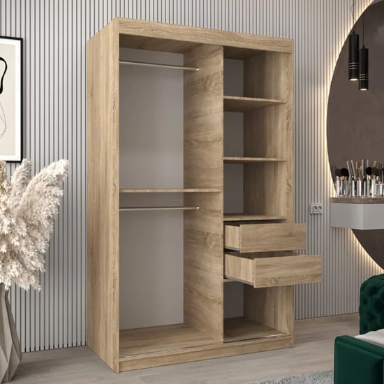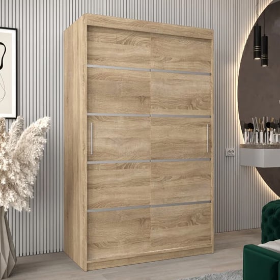 The CHOICEWARDROBE Vevey I Wooden Sliding Wardrobe – 120cm in Sonoma Oak delivers a refined balance of warmth, structure, and efficient storage. Designed for compact bedrooms and contemporary interiors, the Sonoma Oak finish introduces natural depth while maintaining a clean, modern profile.