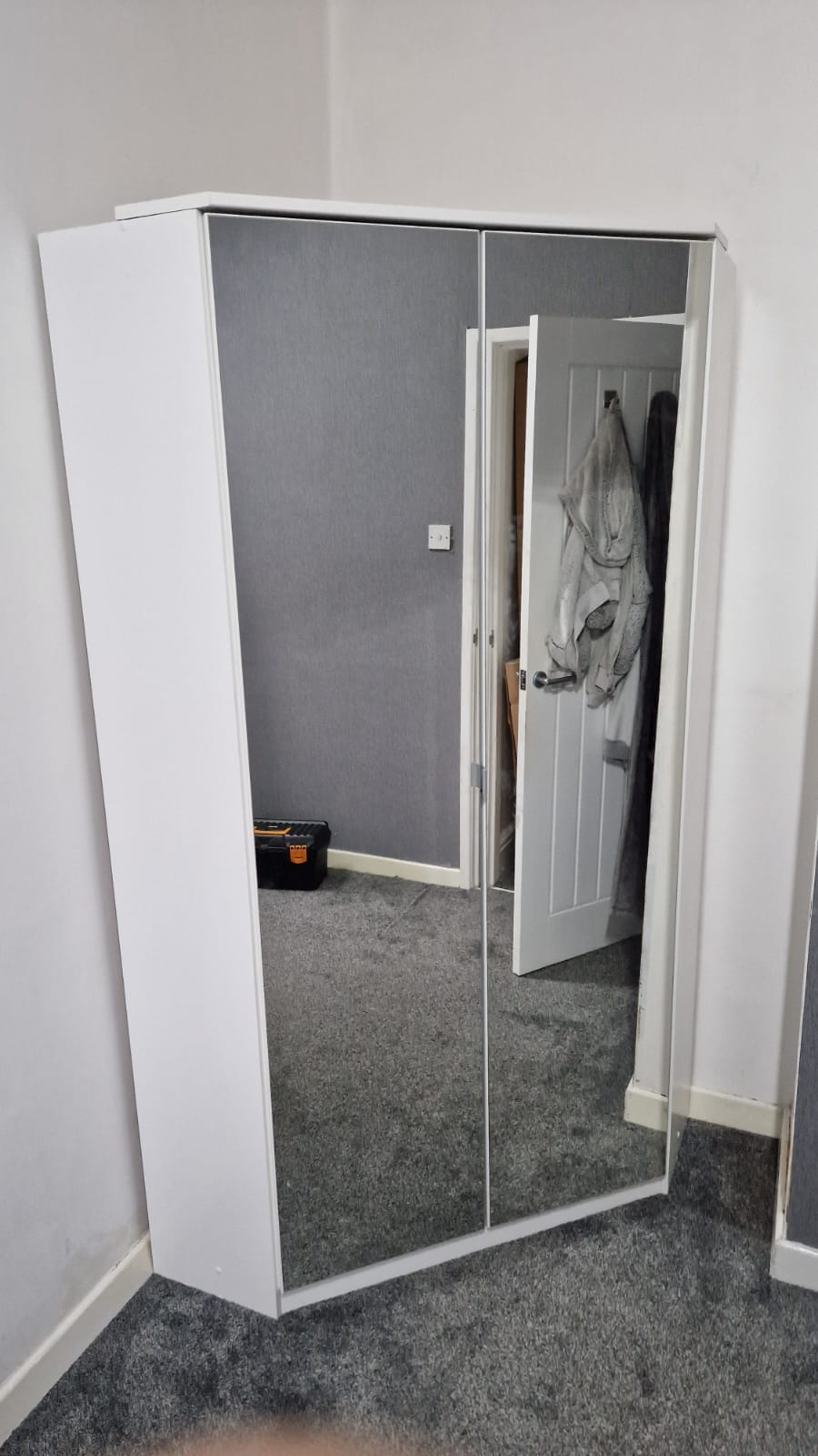 The Novare Wardrobe features two mirrored doors with long, stylish handles that enhance its clean, minimalist look. The mirrored surfaces reflect light beautifully, giving the illusion of a larger, airier space. Perfect for compact rooms, apartments, or fitted corners, it offers convenient hanging storage while seamlessly integrating into modern interiors.