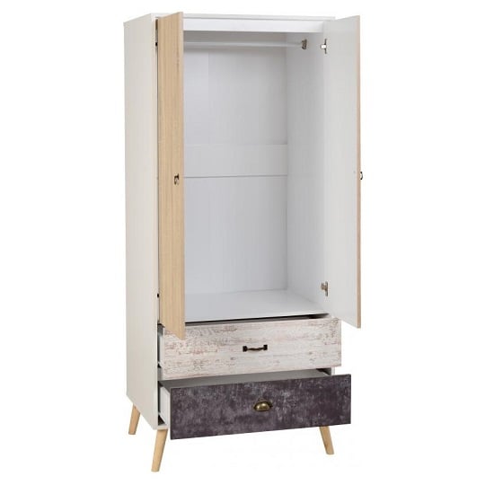 CHOICEWARDROBE Noein 2 Door Wooden Wardrobe – White & Distressed Oak Effect | Modern Retro Design with Dual Drawers & Angled Legs